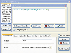 FIGURE 10: NEOTICKER, TRsV. Add the formula indicator to the data series at the "Add Indicator" window. In the "Plot1" field, type: "vol(data1)/avgtruerange(data1,10)."