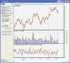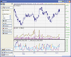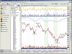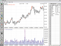 FIGURE 16: SMARTRADER, TRsV. This sample bar chart shows SmartBars in red. The bottom pane shows the volume histogram and the TRsV as a line.For more information on SmarTrader or to download a copy of this SmarTrader specsheet, go to our website at www.stratagem1.com.--Jim Ritter, Stratagem Software