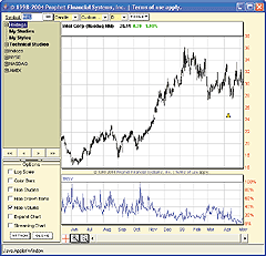 FIGURE 13: PROPHET, TRsV. This sample chart shows Intel's rise from May 1998 to May 1999 as tracked by the true range specified volume (TRsV), shown in blue in the lower chart. The TRsV spiked on June 2, 1998, and October 14, 1998. Both indicate support levels and reversals for the stock.