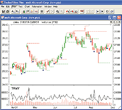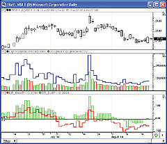 FIGURE 14: INVESTOR/RT, TRsV. This Investor/RT daily candlestick chart of MSFT shows the TRsV indicator in the middle pane, drawn as a blue stepped line, overlaying a volume histogram. In the lower pane, the bull power indicator is drawn as a green histogram with the bear power drawn as a red stepped line.