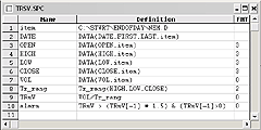 The SmarTrader specsheet is shown in Figure 15. First, we add the true range indicator, Tr_rang, which was originally developed by J. Welles Wilder. Then we add a user formula to divide volume, VOL, by Tr_rang, creating TRsV. Finally, we added an alarm that detects when TRsV exceeds the previous TRsV by 1.5 times. The alarm will allow the use of SmartBars to highlight signals on the bar chart.