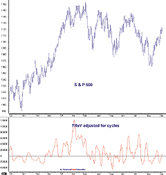 Applying this formula to the S&P 500 since 1998 shows considerable ultra-short-term (that is, two- and three-day) cyclicality. Adjusting for that cyclicality (without introducing lag) and turning the result into an oscillator gives an interesting picture. (Try viewing an SPX chart of the last year.)From inspection of the data, it would seem that, broadly speaking, the TRsV concurs with price activity. That is, relatively high levels of the TRsV seem to be coincident with relatively high levels of the stock index, and vice versa. Further analysis reveals that TRsV and the SPX exhibit positive correlation such that 48% of the variance of one can be explained by the other. As the numerator (volume) is more volatile than the denominator (TR), TRsV is more reflective of changes in volume. We should not be surprised to confirm that the stock market is more attractive to investors (as evidenced by greater volume) when the stock market is at higher levels.
