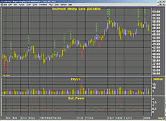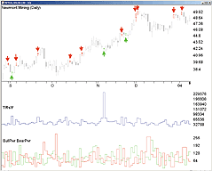FIGURE 21: ASPEN GRAPHICS, TRsV ON A BAR CHART. This sample Aspen chart shows the TRsV on Newmont Mining Corp., along with the bull power indicator in the lower pane. An overlay produces arrows when the TRsV is more than 1.5 times greater than the previous TRsV value.