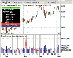 FIGURE 6: eSIGNAL, TRsV. This screenshot shows the true range specified volume indicator on Newmont Mining Corp.