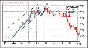 FIGURE 1: A HEAD & SHOULDERS FORMATION. Here you see a head & shoulders formation occur on the daily chart of the New Zealand dollar/US dollar.