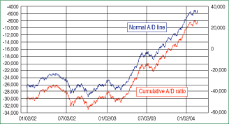 From Figure 1, you can see that for periods of up to a couple of years there is not much difference in appearance between the normal A/D line and the A/D ratio. Because of this, many technical analysts use the raw data for short- to intermediate-term analysis (days to weeks).