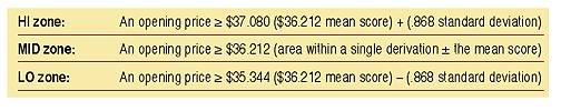 FIGURE 1: THREE PRICE ZONES OF A SIDEWAYS MARKET. The high, middle, and low zones are derived using the mean and standard deviations.