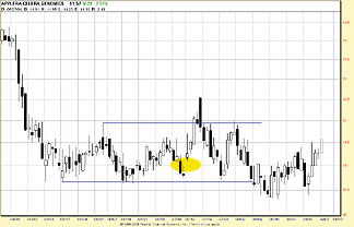 FIGURE 1: COMMON. Here's an example of a common, or area, gap in shares of Applera-Celera Genomics.Breakaway gaps: If common or area gaps are the bane of technical traders, then breakaway gaps represent the boon. This is because while both common and breakaway gaps tend to occur in or near consolidation patterns, it is the breakaway gap that signals the escape of prices from the meanderings of the trading range, and thus the opportunity for significant, directional price movement. Considering breakaway gaps, author Alexander Elder wrote in his book Trading For A Living that: