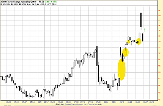 FIGURE 2: CONTINUATION. Runaway gaps abound in this chart of September orange juice futures.Exhaustion gaps: Appropriately enough, the last type of gap discussed here is the exhaustion gap. The exhaustion gap -- next to perhaps the breakaway gap -- is the easiest to recognize, at least in hindsight. Exhaustion gaps might be known as "last gasps" (if you'll forgive the pun); rather than signaling momentum to come (as both breakaway and runaway gaps do), exhaustion gaps signal that momentum is coming to an end. Unfortunately, as Magee reminds us while talking about both continuation gaps and exhaustion gaps, "the first two of these are easily distinguished as to type by their location with respect to the preceding price pattern, but the last is not always immediately distinguishable [from] the second."