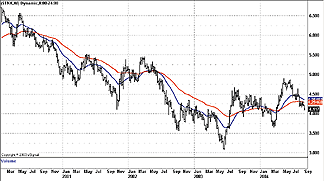 The Swiss franc finds itself late in a bull market that began in the lows of early 2001. The swissy began making higher highs and higher lows on the weekly chart by the first few days of 2002 and, by mid-year, was clearly in an uptrend. The ride up has been volatile in the Swiss franc, with sharp corrections becoming more and more frequent in the first half and summer of 2003. With its rally in summer 2004, the Swiss franc may have made its first significant lower high.