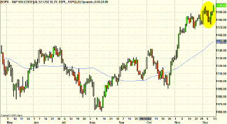 AT THE CLOSE It's been a rather slow month when it comes to trading (I am writing this in December 2004). Perhaps it's because my attention hasn't been so focused on the markets, or perhaps it's just that I wasn't able to find any attractive opportunities, which may be an indication that I should fine-tune my strategies. Perhaps waiting for the 11:00 am (PT) action isn't working anymore. I did make one trade that I would like to share with you. It happened on December 7, and I'll have to admit that I broke the rules on this trade. The Standard & Poor's 500 index was well above its 50-day moving average (Figure 1), so, strictly speaking, I should have only gone long, based on my basic trading rules. But I saw an opportunity arising, and perhaps my confidence led me to open a short position, even though it was contrary to what I should have done.