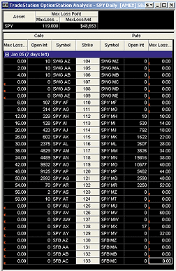 FIGURE 1: TRADESTATION, MAX LOSS POINT. Here's a sample TradeStation: OptionStation analysis for the SPY calculating the max loss point as described in David White's December 2004 article. This code can be downloaded from TradeStationWorld.com. Look for the file "Max Loss Point.eld." The code will require use of an add-on set of functions called global variables. These can also be downloaded from TradeStationWorld.com. Look for the file "Global Variables 2.2.zip."Indicator: Max Loss Point (S) {for Option Pane} variables: OIToStore( 0 ), Sym( "" ), SetTypeRtn( -1 ), SetStrikeRtn( -1 ), SetOIRtn( -1 ) ; if CurrentOpenInt <> 0 then OIToStore = CurrentOpenInt else OIToStore = PrevOpenInt ; Sym = Symbol ; SetTypeRtn = GVSetNamedInt( Sym, OptionType of Option ) ; SetStrikeRtn = GVSetNamedFloat( Sym + " Strike", Strike of Option ) ; SetOIRtn = GVSetNamedInt( Sym + " OI", OIToStore ) ; if SetTypeRtn < 0 or SetStrikeRtn < 0 or SetOIRtn < 0 then RaiseRunTimeError( Sym + ": Error setting named variable!" ) ; Plot1( SetTypeRtn, "SetTypeRtn" ) ; Indicator: Max Loss Point {for Asset Pane} variables: Index( 0 ), Counter( 0 ), Sym( "" ), ErrorString( "Error!" ), NumOpts( 0 ), CounterOuter( 0 ), StrikeOuter( 0 ), CounterInner( 0 ), OptTypeInner( 0 ), StrikeInner( 0 ), OpenIntInner( 0 ), MaxLossStrike( 0 ), MaxLossAmt( 0 ), IntErrorCode( -999 ), FltErrorCode( -999.99 ) ; arrays: OptionTypes[200]( 0 ), OptionStrikes[200]( 0 ), OptionOI[200]( 0 ), CallDollarVal[200]( 0 ), PutDollarVal[200]( 0 ), MaxLossAmts[200]( 0 ) ; Index = 0 ; Counter = 0 ; Sym = GVGetIntNameByNum( Index, ErrorString ) ; while Sym <> ErrorString begin OptionTypes[Counter] = GVGetNamedInt( Sym, IntErrorCode ) ; OptionStrikes[Counter] = GVGetNamedFloat( Sym + " Strike", FltErrorCode ) ; OptionOI[Counter] = GVGetNamedInt( Sym + " OI", IntErrorCode ) ; Counter = Counter + 1 ; Index = Index + 2 ; Sym = GVGetIntNameByNum( Index, ErrorString ) ; end ; NumOpts = Counter ; for CounterOuter = 0 to NumOpts - 1 begin StrikeOuter = OptionStrikes[CounterOuter] ; CallDollarVal[CounterOuter] = 0 ; PutDollarVal[CounterOuter] = 0 ; MaxLossAmts[CounterOuter] = 0 ; CounterInner = 0 ; for CounterInner = 0 to NumOpts - 1 begin OptTypeInner = OptionTypes[CounterInner] ; StrikeInner = OptionStrikes[CounterInner] ; OpenIntInner = OptionOI[CounterInner] ; if StrikeInner < StrikeOuter and OptTypeInner = Call then CallDollarVal[CounterOuter] = CallDollarVal[CounterOuter] + ( StrikeOuter - StrikeInner ) * OpenIntInner else if StrikeInner > StrikeOuter and OptTypeInner = Put then PutDollarVal[CounterOuter] = PutDollarVal[CounterOuter] + ( StrikeInner - StrikeOuter ) * OpenIntInner ; end ; MaxLossAmts[CounterOuter] = CallDollarVal[CounterOuter] + PutDollarVal[CounterOuter] ; end ; MaxLossStrike = OptionStrikes[0] ; MaxLossAmt = MaxLossAmts[0] ; for Counter = 1 to NumOpts - 1 begin if MaxLossAmts[Counter] < MaxLossAmt then begin MaxLossAmt = MaxLossAmts[Counter] ; MaxLossStrike = OptionStrikes[Counter] ; end ; end ; Plot1( MaxLossStrike, "MaxLossStrk" ) ; Plot2( MaxLossAmt, "MaxLossAmt" ) ;--Mark MillsGO BACK