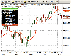 Such adaptive filters can be coded easily using the AmiBroker Formula Language (AFL), and it takes just a few lines of code. Listing 1 shows the formula that plots a price chart and the adaptive moving average described in Ehlers' article. A sample chart is shown in Figure 3.