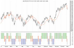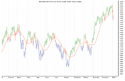 FIGURE 2: eSIGNAL, MEDIAN ADAPTIVE FILTER. Here is a demonstration of the median adaptive filter in eSignal. /***************************************************************** Provided By : eSignal (c) Copyright 2005 Description: Median-Average Adaptive Filter - by John F. Ehlers Version 1.0 1/7/2005 Notes: March 2005 Issue - "The Secret Behind The Filter: What's The Difference?" Formula Parameters: Defaults: Thickness 2 Color Red *****************************************************************/ function preMain() { setPriceStudy(true); setStudyTitle("Median-Average Adaptive Filter "); setCursorLabelName("MAAF", 0); setShowTitleParameters(false); // Study Parameters var sp1 = new FunctionParameter("nThick", FunctionParameter.NUMBER); sp1.setName("Thickness"); sp1.setDefault(2); var sp2 = new FunctionParameter("cColor", FunctionParameter.COLOR); sp2.setName("Color"); sp2.setDefault(Color.red); } var bEdit = true; var Price = new Array(4); var Smooth = new Array(39); var nFilter = null; var nFilter_1 = 0; var Value2 = 0; var Value2_1 = 0; var nThreshold = 0.002 function main(nThick, cColor) { if (bEdit == true) { setDefaultBarThickness(nThick); setDefaultBarFgColor(cColor); bEdit = false; } var nState = getBarState(); if (nState == BARSTATE_NEWBAR) { nFilter_1 = nFilter; Value2_1 = Value2; Price.pop() Price.unshift((high(0)+low(0))/2) Smooth.pop(); Smooth.unshift(0); } Price[0] = (high(0)+low(0))/2; if (Price[3] == null) return; Smooth[0] = (Price[0] + (2 * Price[1]) + (2 * Price[2]) + Price[3]) / 6; if (Smooth[38] == null) return; var Length = 39; var Value3 = .2; var alpha, Value1; while (Value3 > nThreshold) { alpha = 2 / (Length + 1); Value1 = Median(Length); Value2 = alpha*Smooth[0] + (1 - alpha)*Value2_1; if (Value1 != 0) Value3 = Math.abs(Value1 - Value2) / Value1; Length = Length - 2; if (Length <= 0) break; } if (Length < 3) Length = 3; alpha = 2 / (Length + 1); nFilter = (alpha*Smooth[0] + (1 - alpha)*nFilter_1); return nFilter; } function Median(Length) { var aArray = new Array(Length); var nMedian = null; for (var i = 0; i < Length; i++) { aArray[i] = Smooth[i]; } aArray = aArray.sort(compareNumbers); nMedian = aArray[Math.round((Length-1)/2)]; return nMedian; } function compareNumbers(a, b) { return a - b }--Jason KeckGO BACK