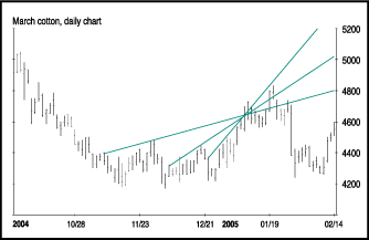 FIGURE 1: A BOTTOMING PHASE. By drawing reverse trendlines on this March cotton chart, you can see that a bottom has been reached.That next identified line would most likely be an upward sloping line off of two successive highs occurring during the corrective phase of the most recent uptrend. One example would be a line drawn on the B wave of an ABC correction. Furthermore, during a bottoming phase, the minor corrective rallies identify reverse trendlines (up) with each successive rally occurring at a lower level along the way. The further you move down and to the right of the chart, the more likely it is you should look for reverse lines with steeper angles of ascent so that the two, three, or more lines will all converge at one point. If you place this point of convergence to the right of the current action on the chart, you can visualize this as a new target for a rally.
