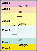 FIGURE 1: THE HOT ZONES. Here you see a single price bar divided into five zones.Starting from the same point that I did in the hot zones article, I created a specific algorithm (see msPattPos Function in the sidebar) to compare each of the single elements of a market bar (open/high/low/close) with the previous bar range and place it in a well-defined zone. Each zone has a numerical reference, so the algorithm will return a sort of “four-number code” to pinpoint that specific pattern. In Figure 1, the single bar is divided into zones (from zero to 5). Here is the description of each zone: