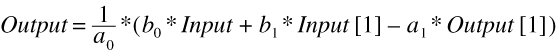 This equation is easily converted to indicator programming languages. For example, in EasyLanguage, N units of delay is noted as [N] after the variable. Thus, the transfer function programs to: