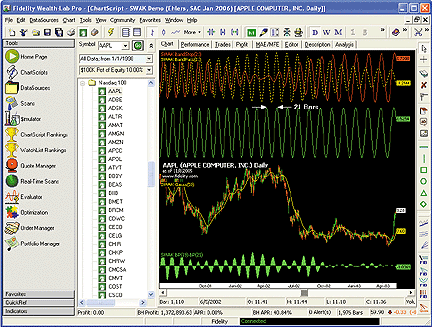 FIGURE 2: WEALTH-LAB, CHIRPED SINE WAVE. Here's a sample implementation of the chirped sine wave in Wealth-Lab.WealthScript code: {$I 'SWAK'} var Bar, CSW, CSWPane, SPane, OPane, bc, n, hBS, hBP, hGauss, hDiff: integer; var t, StartFrq, Rate: float; SetColorScheme( #Green, #Red, #Blue, #Black, #Black, #White ); bc := BarCount; StartFrq := Trunc( bc / 100 ); Rate := Trunc( bc / 25 ); {* Create and plot a chirped sine wave, decreasing frequency *} CSW := CreateSeries; n := bc - 1; for Bar := 0 to bc - 1 do begin t := Bar / bc; @CSW[n] := Sin( 360 * ( StartFrq + t * Rate ) * t ); Dec( n ); end; CSWPane := CreatePane( 100, true, true ); PlotSeriesLabel( CSW, CSWPane, #Lime, #Thin, 'Chirped Sine' ); {* Run the Chirped signal through the filters and plot *} SPane := CreatePane( 100, true, true ); hBS := SWAKSeries( CSW, 21, 'BS' ); PlotSeriesLabel( hBS, SPane, #Red, #Thin, 'SWAK BandStop(21)' ); hBP := SWAKSeries( CSW, 21, 'BP' ); PlotSeriesLabel( hBP, SPane, #Yellow, #Dotted, 'SWAK BandPass(21)' ); {* Predictive oscillator *} OPane := CreatePane( 100, false, false ); hDiff := SubtractSeries( SWAKSeries( #Close, 19, 'BP' ), SWAKSeries( #Close, 21, 'BP' ) ); PlotSeriesLabel( hDiff, OPane, #Lime, #Histogram, 'SWAK BP(19)-BP(21)' ); {* Plot the SWAK Gaussian of the #Close series *} hGauss := SWAKSeries( #Close, 50, 'Gauss' ); PlotSeriesLabel( hGauss, 0, #Yellow, #Thin, 'SWAK Gauss(50)' ); HideVolume;--Robert SucherGO BACK