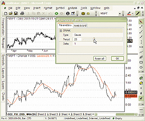 In "Swiss Army Knife Indicator," John Ehlers presents an indicator that is based on the second-order infinite impulse response (IIR) filter. IIR filters are widely used in almost every digital signal processing application. In the code listing given here, we have presented AmiBroker's implementation of the SWAK indicator (second-order IIR filter). Included is some sample code that produces a point-change chart and IIR-filtered output. After applying the indicator, the parameter window (Figure 3) can be used to control the type of filter used and its parameters, such as averaging period.