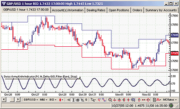 To attach the SWAK indicator to a chart, right-click with the mouse within the chart window, select "Add Indicators," then "Swiss Army Knife Indicator" from the list. Users will have the ability to customize the parameters at this time. Once attached to the chart, the parameters can be customized by right-clicking with the mouse over the displayed indicator label and selecting "properties." Figure 7 shows a GBP/USD one-hour candlestick chart in VTtrader with the Swiss Army Knife indicator applying a band-stop filter to median price data.