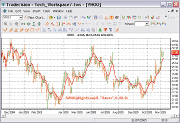 FIGURE 8: TRADECISION, SWISS ARMY KNIFE INDICATOR. Here is the SWAK indicator (the red line) with the period set at 20, Gauss type, on a daily chart of YHOO.You also can create the SWAK function that you can use as a trading rule or a neural model input. The SWAK function and indicator can be downloaded as "Swak.tfn" and "Swak.tnd" files from the Tradecision Knowledgebase at https://www.tradecision.com/knowledgebase.htm. You will need to import them in the Function and Indicator Builders.--Alex Grechanowski