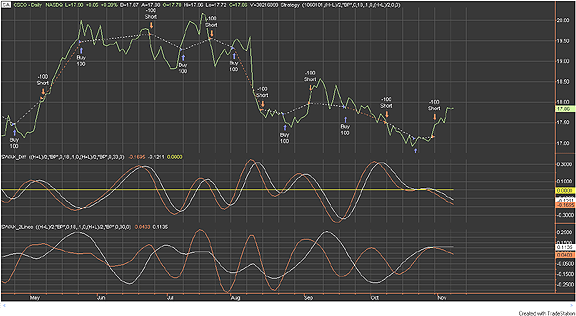 FIGURE 1: TRADESTATION, SWISS ARMY KNIFE INDICATOR. The subgraph 1 at the top of the chart shows CISCO daily line-on-close bars. The trades shown are generated by the strategy "SWAK_ConvDiv." Directly beneath the price bars is the "SWAK_Diff" indicator (in subgraph 2). Subgraph 3 shows the filtered price series calculated by the indicator "SWAK_2Lines."