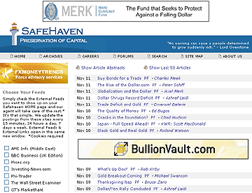As a website, SafeHaven.com couldn't be simpler or easier to operate. The left side of the home page provides readers with an opportunity to subscribe to free external feeds from sources like BBC Business (UK edition), Mises.org, and The Wall Street Examiner. Below that are a set of external links to a number of popular financial websites-such as MarketWatch, TheStreet.com, and Yahoo! Finance-as well as to some lesser-known but highly regarded websites like Prudent Bear and Financial Sense, Sharelynx and Kitco.