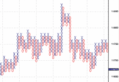 Let's take an example of a 1x3 P&F chart. Assuming that the established direction is up (X columns) and the price range is 118.40 to 118.80, when the price advances another 10 pips, such as from 118.80 to 118.90, you mark it an additional X. You will disregard any price activity between 118.99 (not 10 pips up from 118.90) and 118.61 (not 30 pips down from 118.90). The direction turns down into an Os column only when the price falls 30 pips from 118.90 to 118.60. Then you write three consecutive Os and the main direction is now down.