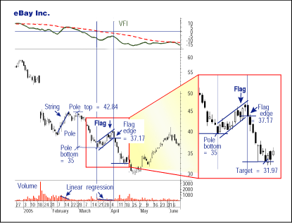 FIGURE 1: FLAG FORMATIONS, eBAY. It is not uncommon for bear flags to appear in pairs. In this chart, the bear flag in late March 2005 was preceded by a string. Note the precipitous decline of the money flow (VFI) in the top window and also the volume decline during both formations in the bottom window depicted by the volume linear regression line (in blue). All target and pole numbers refer to the flag and not the string....Continued in the May issue of Technical Analysis of STOCKS & COMMODITIES