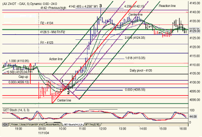 The pitchfork technique should be a standard tool to use when trying to measure the slope of the trend of wave 3. The slope is important because its characteristics play a part in defining the exit. In the pitchfork method, a technician will pick an extreme low or high to use as an anchor pivot point and draw a median line. Action and reaction lines are drawn through high and low points, defining the support and resistance levels for the price channel. In Figure 1, the exit at 4135 takes place where the market price crosses with the first upper parallel line above the center line.