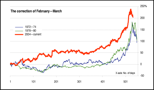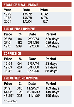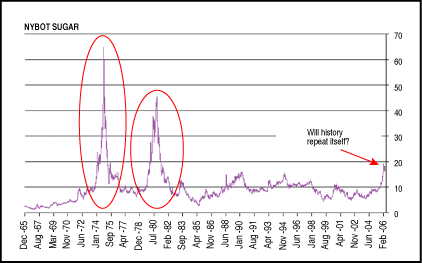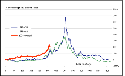 Figure 1: NYBOT sugar. Will history repeat itself? That remains to be seen.Even more remarkable is that the current upmove in sugar seems to be following the pattern of the earlier two cycles. In Figure 3, the percentage moves and time taken for each phase of the boom periods of all three cycles (1972-76, 1978-82, and 2004-present) are displayed. Clearly, both earlier cycles had similar first acts, and the same thing seems to be happening this time around. The eventual fall, still in the distant future, will be the second act, of course.