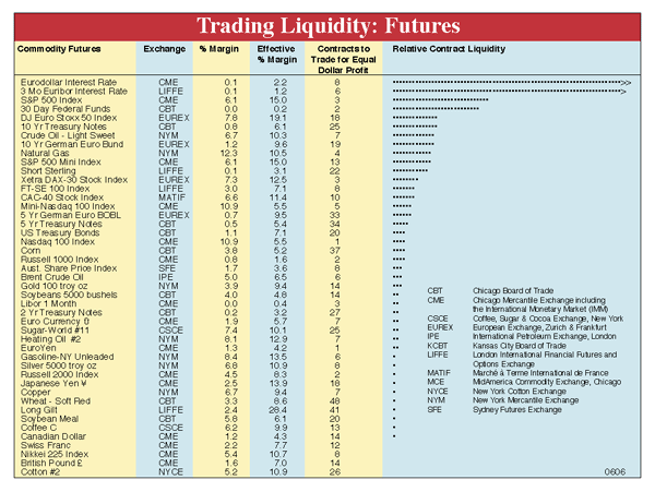 Trading Liquidity: Futures is a reference chart for speculators. It compares markets according to their per-contract potential for profit and how easily contracts can be bought or sold (i.e., trading liquidity). Each is a proportional measure and is meaningful only when compared to others in the same column. The number in the "Contracts to Trade for Equal Dollar Profit" column shows how many contracts of one commodity must be traded to obtain the same potential return as another commodity. Contracts to Trade = (Tick $ value) x (3-year Maximum Price Excursion). "Relative Contract Liquidity" places commodities in descending order according to how easily all of their contracts can be traded. Commodities at the top of the list are easiest to buy and sell; commodities at the bottom of the list are the most difficult. "Relative Contract Liquidity" is the number of contracts to trade times total open interest times a volume factor, which is the greater of: 1 or exp (1n (volume) / 1n (5000)) - 2.
