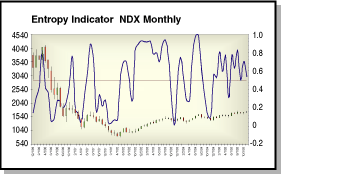 FIGURE 1: ENTROPY INDICATOR. On this monthly chart of the NDX, note where the ups and downs match up with price movements.