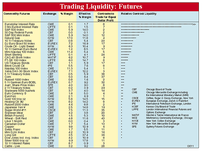 Trading Liquidity: Futures is a reference chart for speculators. It compares markets according to their per-contract potential for profit and how easily contracts can be bought or sold (i.e., trading liquidity). Each is a proportional measure and is meaningful only when compared to others in the same column. The number in the "Contracts to Trade for Equal Dollar Profit" column shows how many contracts of one commodity must be traded to obtain the same potential return as another commodity. Contracts to Trade = (Tick $ value) x (3-year Maximum Price Excursion). "Relative Contract Liquidity" places commodities in descending order according to how easily all of their contracts can be traded. Commodities at the top of the list are easiest to buy and sell; commodities at the bottom of the list are the most difficult. "Relative Contract Liquidity" is the number of contracts to trade times total open interest times a volume factor, which is the greater of: 1 or exp (1n (volume) / 1n (5000)) - 2.