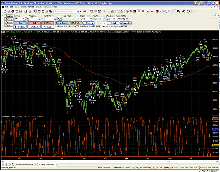 FIGURE 1: TRADESTATION, STOCHASTICS WITH A LONG-TERM EMA FILTER. Here is a daily chart of synthetic SPY data, with the Colby stochastic indicator and strategy applied.