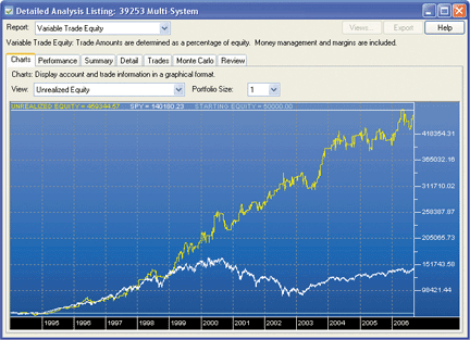 The article provides a performance report for the period 1981-2006 based on a synthetic SPY price history. Since the SPY exchange traded fund (ETF) began trading in 1993, the SPY and S&P 500 index datafiles were merged to create the synthetic price history. Although the synthetic data on which we tested our EasyLanguage code probably differs slightly from Colby's, the strategy's performance is similar to what was reported in the article. A sample result can be seen in Figure 1.