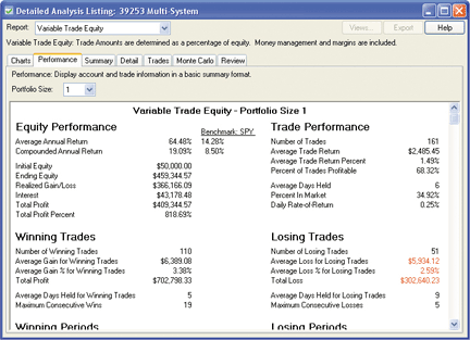 Now that you have saved your new strategy, you can run the strategy by clicking the Run button. This will bring up the Performance Reports for this strategy.