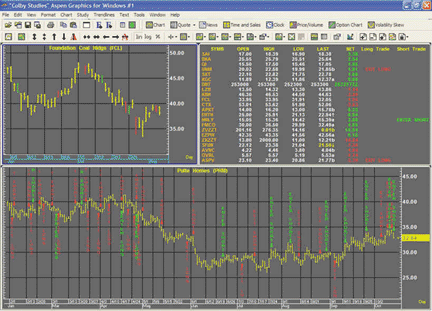 The key to approaching Colby's system in Aspen Graphics is to break the logic into separate formulas. This approach allows a trader to use the results of these formulas in any analysis method available in Aspen Graphics (that is, in overlays or studies for output on charts or quote windows, to trigger an alarm, or to create color rules). See Figures 12 and 13.