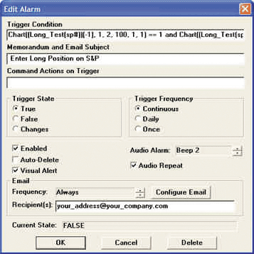 This Aspen Graphics alarm configuration generates audio and visual alerts (Figure 14). It also sends an email alerting one or more recipients to the market's condition.