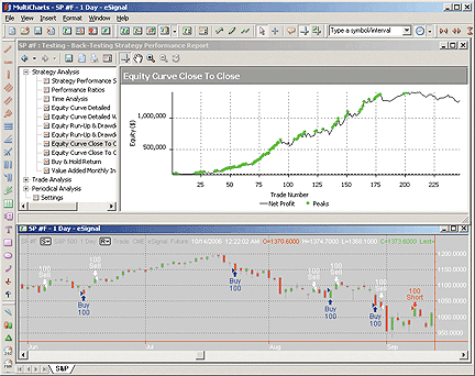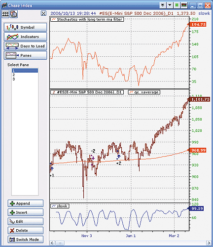 FIGURE 15: MULTICHARTS, STOCHASTICS WITH A LONG-TERM EMA FILTER. On this daily chart of S&P futures, you can see how the strategy fared.