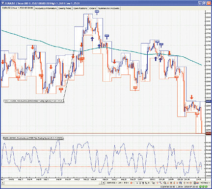 FIGURE 16: VT TRADER, STOCHASTICS WITH A LONG-TERM EMA FILTER. Here is a sample EUR/USD two-hour candlestick chart with the trading system attached.--Chris Skidmore