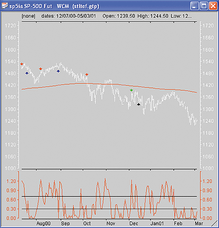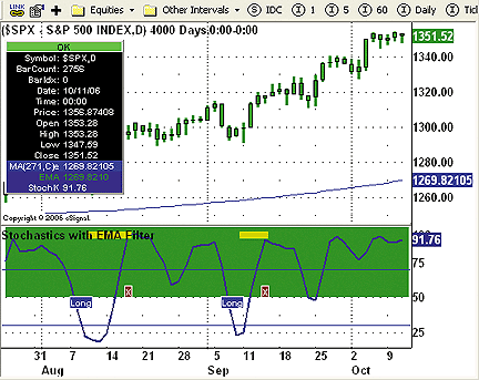 FIGURE 9: TRADECISION, STOCHASTICS WITH A LONG-TERM EMA FILTER. To reduce the time required for optimization, we can either reduce the number of optimization parameters or use genetic algorithms for the optimization. Genetic algorithms possess the best characteristics of the other optimization methods, such as robustness and fast convergence, which does not depend on any of the optimization criteria (for instance, smoothness).