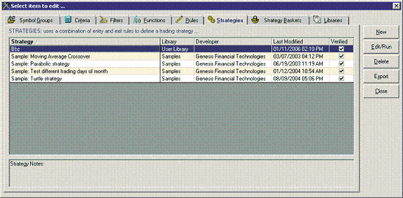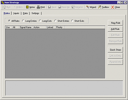 (2) Click on the New button. This will open a New Strategy window. (FIGURE 2) If you are asked if you would like to use the Wizard, click the NO button.