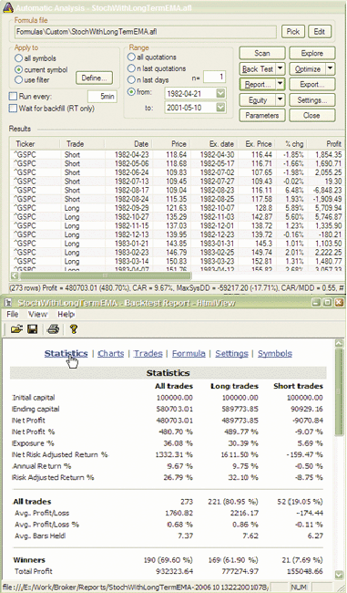 FIGURE 3: AMIBROKER, STOCHASTICS WITH A LONG-TERM EMA FILTER. This screenshot shows sample results of a backtest of Robert Colby's trading system.--Tomasz Janeczko, AmiBroker.com