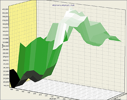 Taking a quick look at one of the six possible optimization spaces for four variables, we see that #OptVar4, the EMA period, significantly influences profit. While we used a shorter test period (January 1993-October 2006), the graph indicates that values in the range 250 to 280 are good choices for a stable system -- that is, a profitable range of values with no steep dropoffs. Conversely, choosing a more-profitable value near 230 would be an example of overfitting.