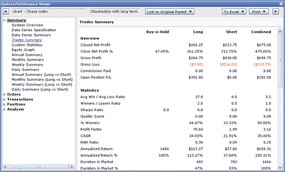 FIGURE 11: STRATASEARCH, PERFORMANCE SUMMARY. As suggested by Robert Colby, the system outperforms a buy & hold approach. Transaction fees and adjustments, however, could minimize the returns.