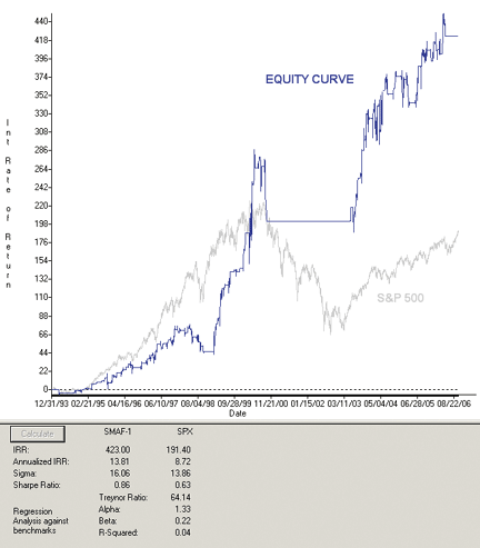 FIGURE 8: AIQ, STOCHASTICS WITH A LONG-TERM EMA FILTER. Here is the equity curve for the SMAF system compared to the S&P 500 index.