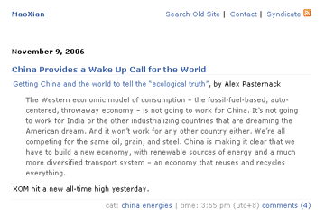 A glance at recent posts is always a good way of getting a sense of what a blog is up to lately. And such a glance in MaoXian's direction yields a blog that is as concerned about stocks and market movement as anything else, though more than willing to engage in conversation about the topic du jour (as of this writing, the midterm elections of 2006), the odd social observation (an article on how "men need deep emotional connections with other men, not just their wives" that MaoXian claims is a vindication of the guys'-night-out poker game) and, of course, the admittedly "gratuitous cute chick pic," which tends to consist of comely ladies from the world's most populous nation.