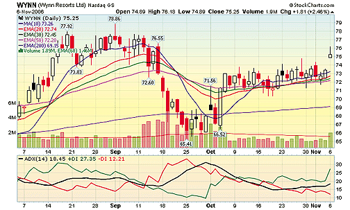 On November 6, 2006, Wynn gapped higher on the open (Figure 1). Why did it gap open? Does it matter? I am a technical trader and have found some of my best trades are when I let the price action dictate my decisions and when I resist the urge to find out what is going on by visiting the message-boards, news wires, and headlines concerning the stock.