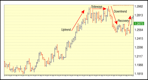 Figure 1 shows a clear uptrend, a sideways area, a downtrend, and finally a recovery in the euro/dollar. The uptrend was lengthy but the first part was choppy, which likely made it difficult to hold long positions. However, daytraders probably profited from that rough period if they were able to weave their way through the market without holding positions for too long.